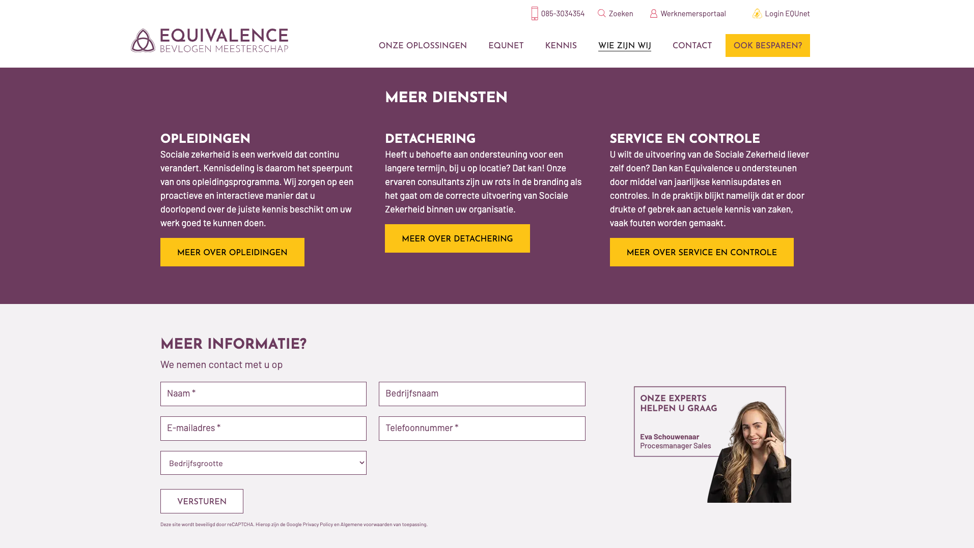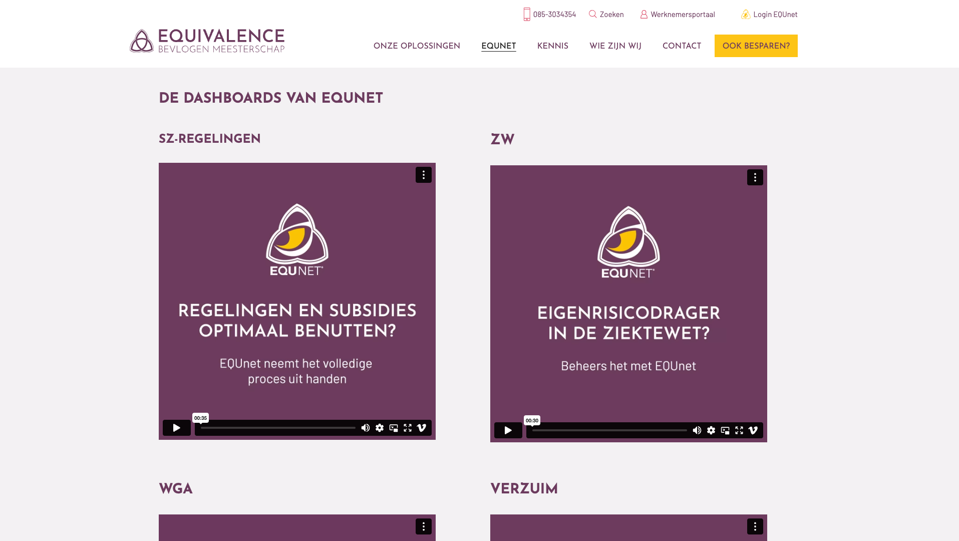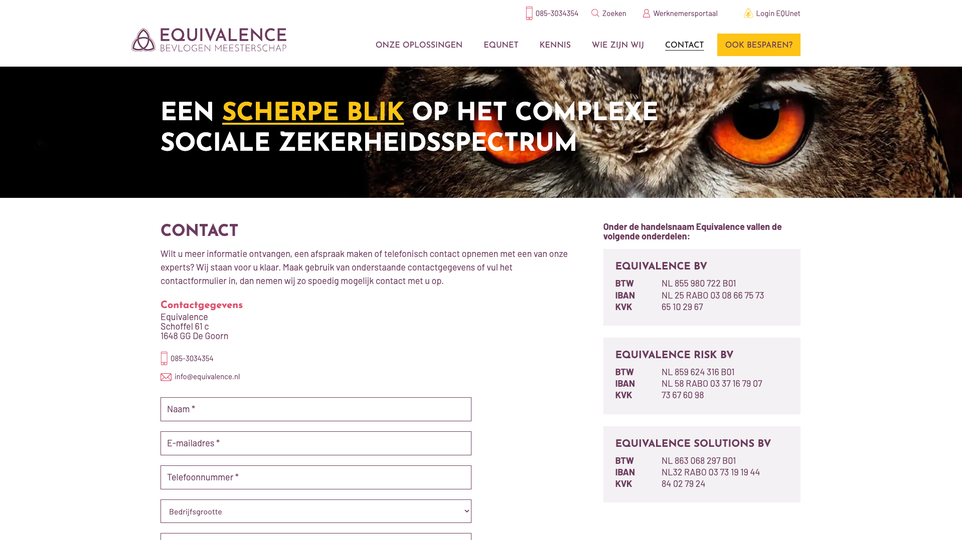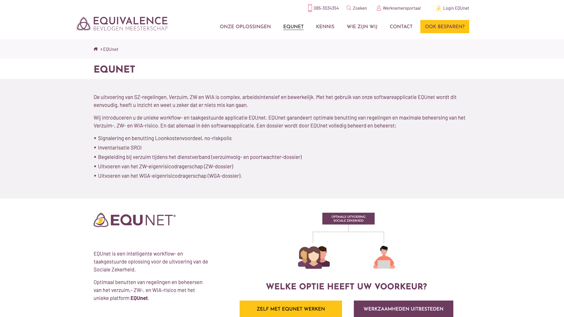 Sociale zekerheid is een complex werkveld. Equivalence vindt het daarom extra belangrijk dat de website overzichtelijk blijft en dat de bezoeker snel kan vinden wat hij zoekt. Op de nieuwe website kan de bezoeker op meerdere manieren navigeren. Het menu heeft twee lagen. De algemene informatie vind je in de bovenste laag, de diensten staan een level lager. De doelgroep (bedrijfseigenaren, directieleden en HR specialisten) ziet in één oogopslag waar hij moet zijn. Maar ook via de graphic op de homepage, de zogenoemde Equivalence Scan, kan een bezoeker navigeren.