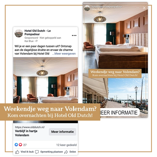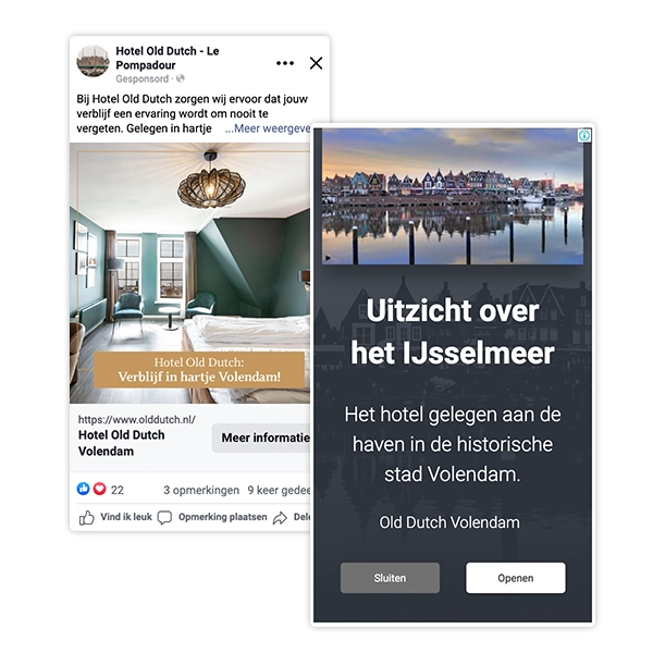 We ontwikkelden meerdere varianten van koppen, beschrijvingen en primaire teksten. Ook voor de beelden maakten we diverse versies: sfeervolle beelden van de omgeving, de wijnbar en de kamers, aantrekkelijk vormgegeven in de huisstijl van Old Dutch met pakkende teksten. Meta combineert deze elementen automatisch, zodat we snel inzicht krijgen in welke combinaties het beste werken bij de doelgroep.