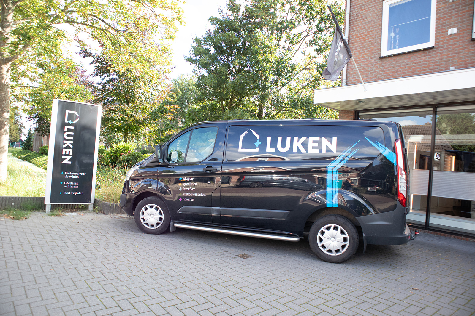 Deze visuele identiteit is doorvertaald naar diverse communicatiemiddelen, zoals briefpapier, visitekaartjes, enveloppen, aankoopbevestigingen en flyers, waarmee Luken een professionele en consistente uitstraling naar klanten behoudt. Daarnaast is de huisstijl toegepast op busbelettering, bedrijfskleding, advertenties, posters, raamstickers, spandoeken en vlaggen, zodat het merk zowel in de winkel als in de buitenwereld zichtbaar en herkenbaar blijft.