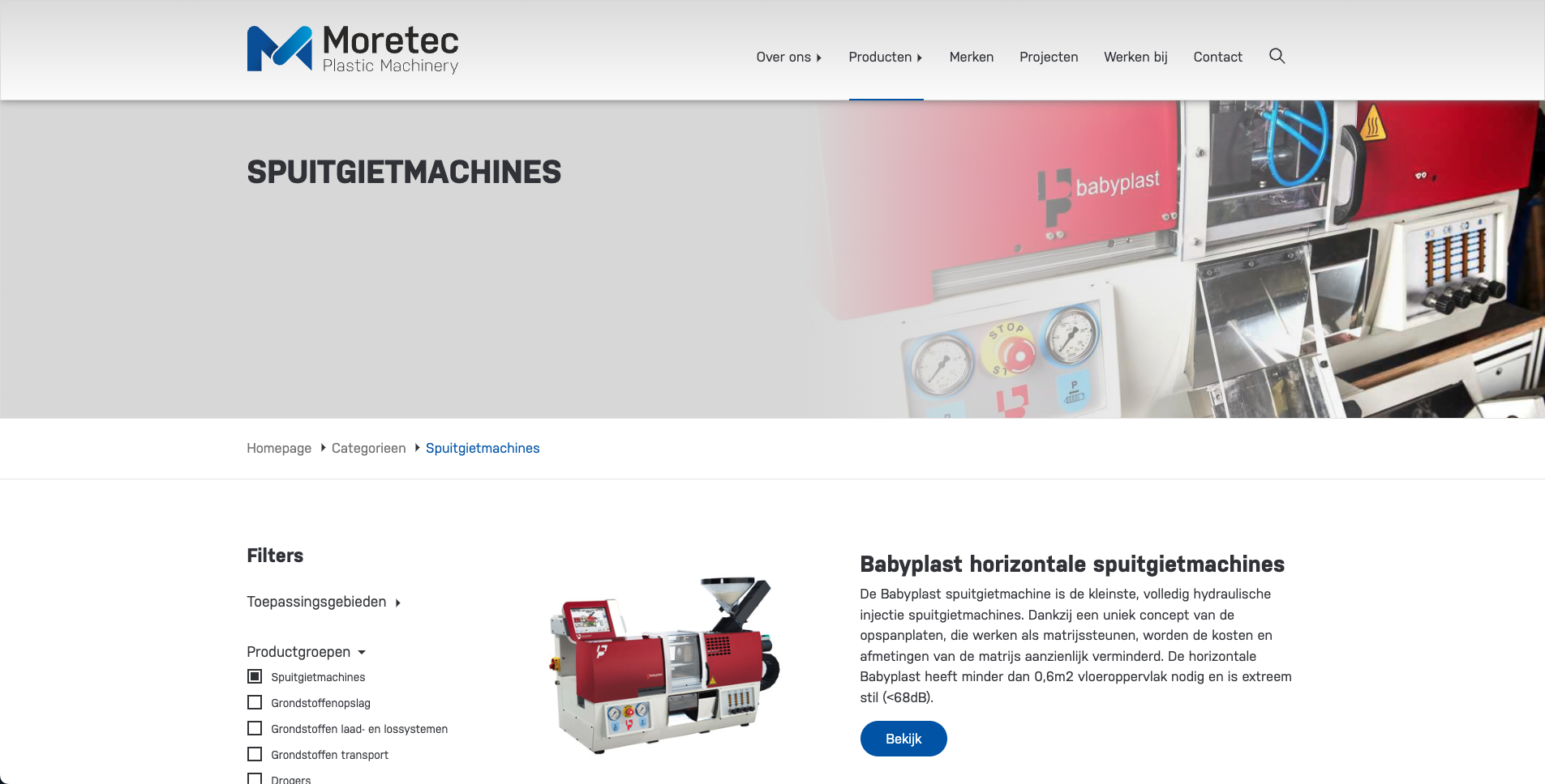Moretec Plastic Machinery is een toonaangevende leverancier van spuitgietmachines en randapparatuur voor de kunststofverwerkende industrie. Ze leveren hoogwaardige machines en apparatuur die voldoen aan de hoogste kwaliteitsnormen. Daarnaast kun je bij Moretec terecht voor service, onderhoud, inspectie en inbedrijfstelling. De missie van Moretec is klanten slimmer en efficiënter te laten produceren. Ze denken echt met de klant mee voor de perfecte oplossing. Daarbij staat persoonlijke aandacht op nummer 1.