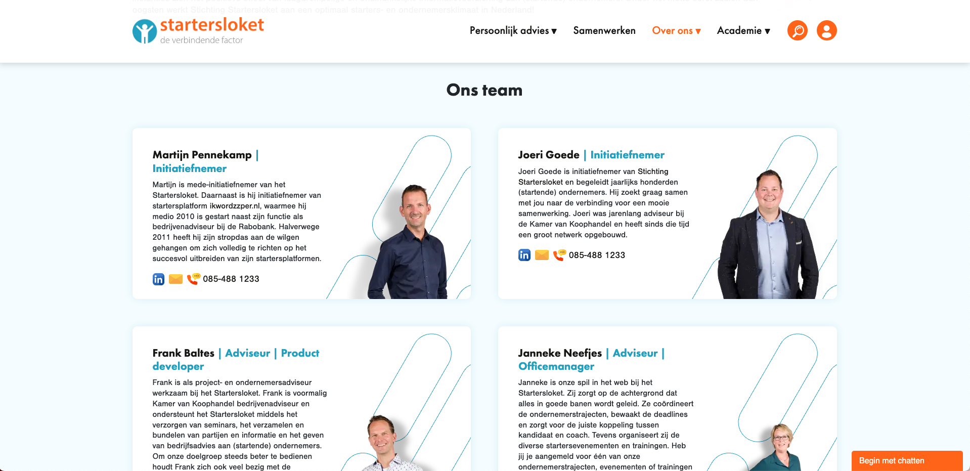 Om tot het beste resultaat te komen hebben we veel samengewerkt met Joeri en Frank. Zo hebben we eerst een mooi design neergezet voor een nieuwe website waarmee we ondernemers kunnen informeren over de diensten en waarbij we gemeentes kunnen aantrekken om zich aan te sluiten bij het Startersloket. Vervolgens hebben we ons helemaal verdiept in het volledige stappenplan wat de startende ondernemer aflegt en hebben hier een online uitwerking van gemaakt.
