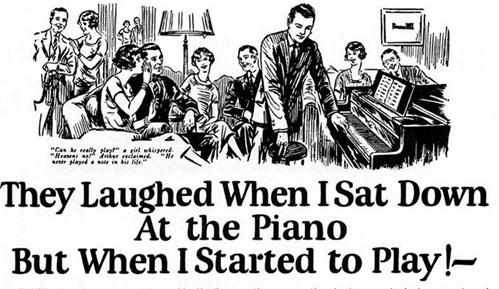 Deze advertentie is gemaakt in 1926 en is een van de meest populaire en succesvolle advertenties. Hij verkoopt niet direct pianolessen, nee hij intrigeert door de verwijzing naar de emotionele voordelen van het leren van een nieuwe vaardigheid.