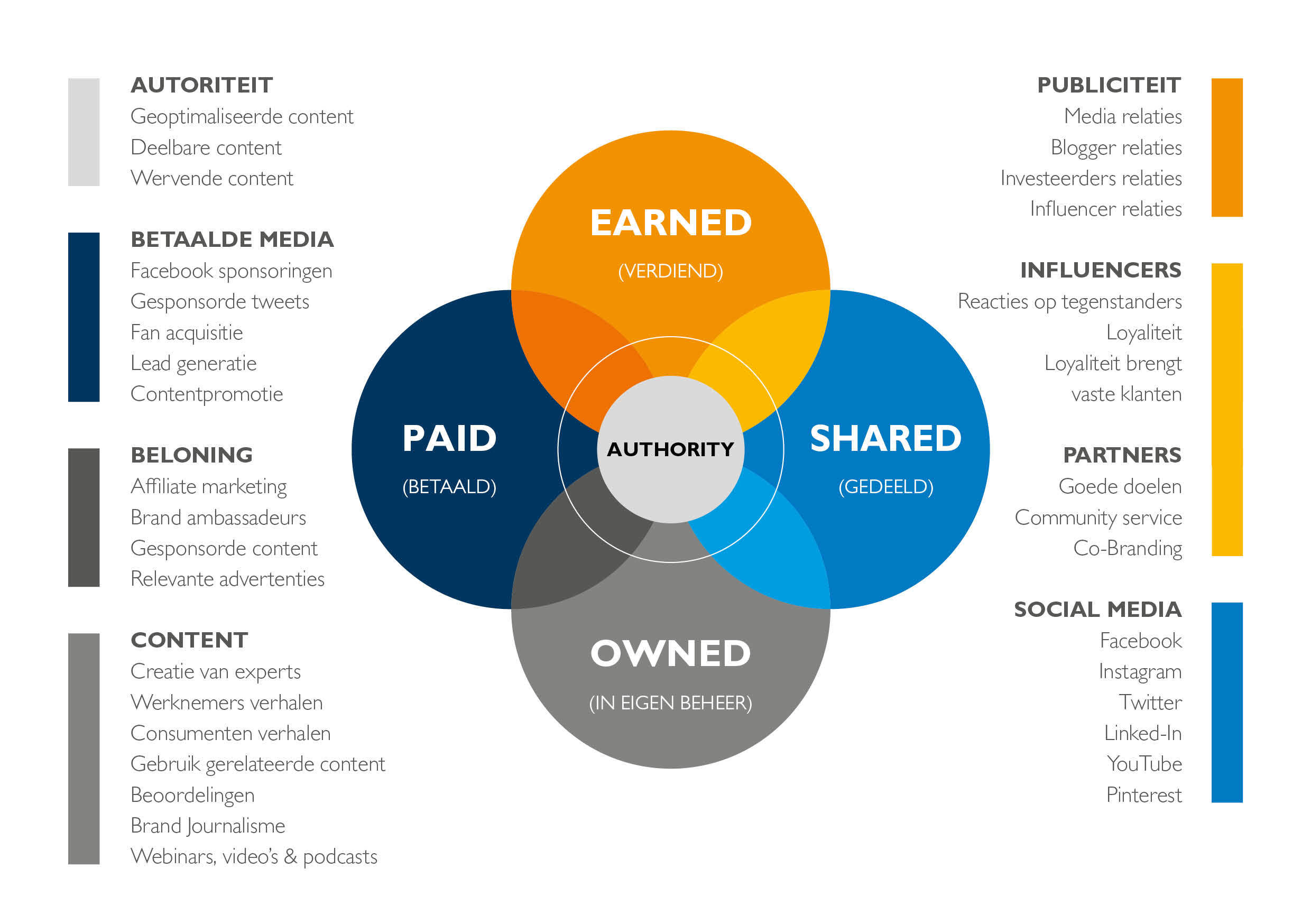 PESO staat voor ‘Paid’, ‘Earned’, ‘Shared’ en ‘Owned’ media. Het PESO-model geeft meer inzicht in de marketingmix. Hoewel veel bedrijven zich slechts focussen op één of twee segmenten, bestaat de ideale mix uit een combinatie van deze vier elementen. Het meest voorkomende segment bij dit model is Paid media. Met het PESO-model diep jij je in de content die voor de doelgroep relevant en waardevol is en je speelt in op de informatiebehoefte tijdens bijvoorbeeld het aankoopproces.