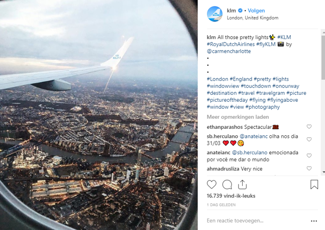 Bij grote bedrijven zie je dat ze goed gebruik maken van hashtags. Wat zij vaak doen is starten met een korte introtekst waarin zij vaak al een hashtag gebruiken. Daarna laten ze wat witruimte over om vervolgens af te sluiten met een rijtje goede en bijpassende hashtags. Zie hieronder een Instagrampost van KLM en hoe zij het aanpakken: