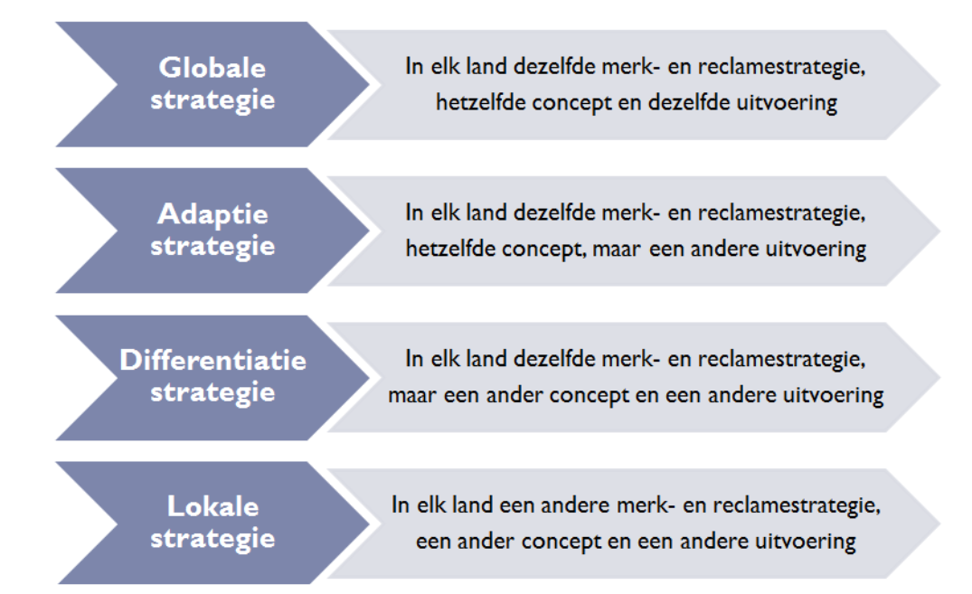 Floor en van Raaij (Marketingcommunicatie strategie, 5e druk, p. 367-368) onderscheiden een viertal strategieën om internationaal marketing uit te voeren. Met behulp van deze strategieën kan een bedrijf op vier verschillende manieren hun afzetmarkten bewerken.