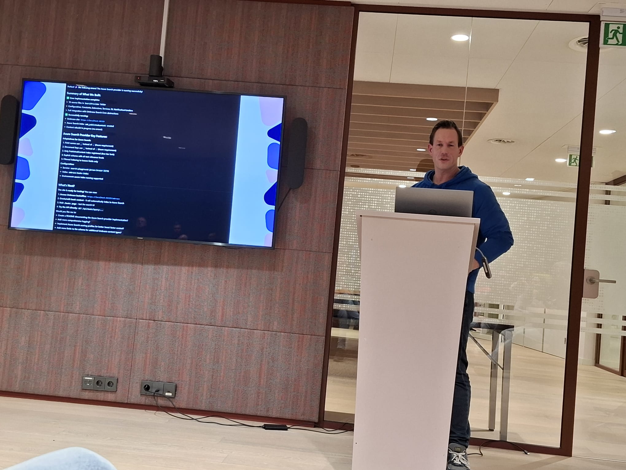 Tijdens het tweede deel van de avond lieten Johan Reitsma (ilionx) en Jeroen Breuer (IO) zien hoe het nieuwe package Umbraco.Cms.Search werkt. Ze demonstreerden hoe je met Azure Cognitive Search een krachtige zoekfunctie kunt bouwen binnen Umbraco.